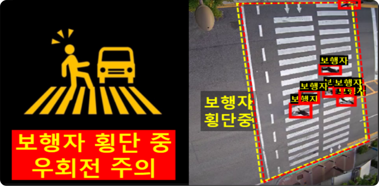 횡단보도 및 횡단대기구역 내의 보행자를 검지, 대형 디스플레이에 실시간으로 안내함으로써 우회전 차량의 횡단보도 내 교통사고를 예방하는 시스템입니다..