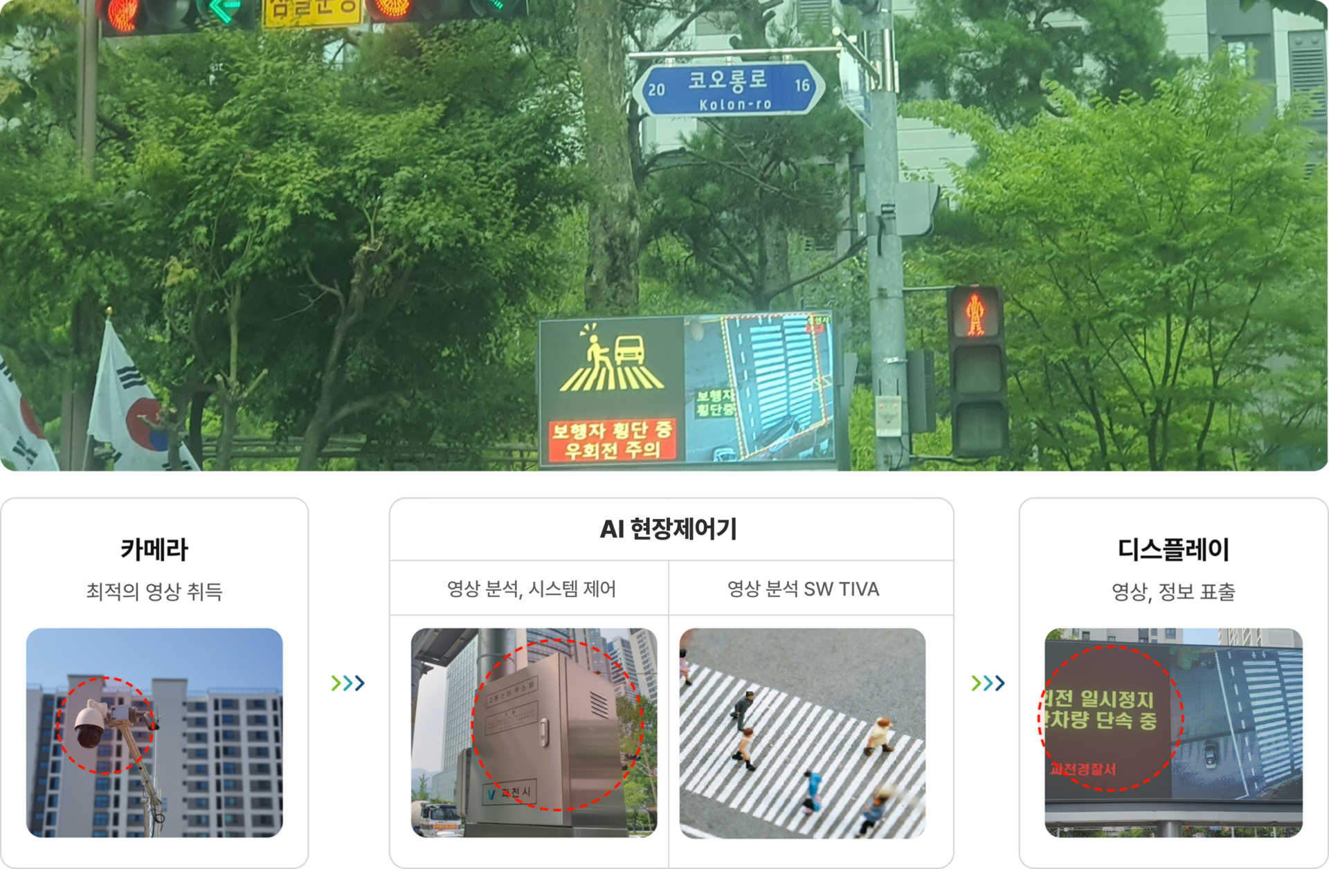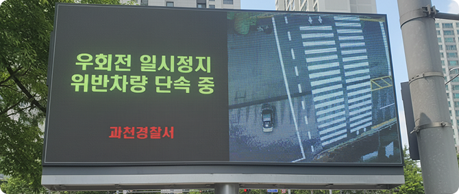 횡단보도 및 횡단대기구역 내의 보행자를 검지, 대형 디스플레이에 실시간으로 안내함으로써우회전 차량의 횡단보도 내 교통사고를 예방하는 시스템입니다.
